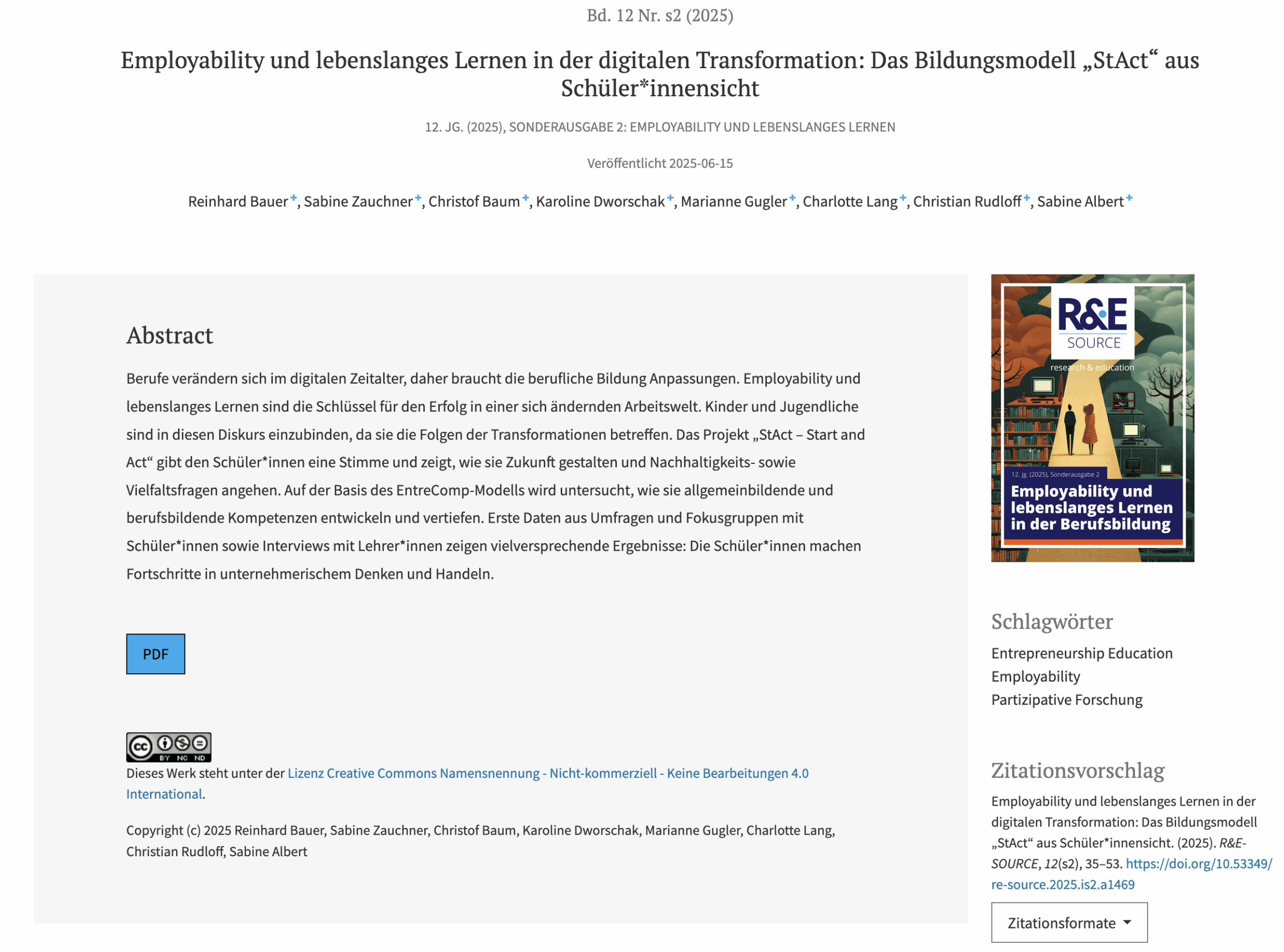 - R. Bauer, S. Zauchner, C. Baum, K. Dworschak, M. Gugler, C. Lang, C. Rudloff, & S. Albert (2025). Employability und lebenslanges Lernen in der digitalen Transformation: Das Bildungsmodell „StAct“ aus Schüler*innensicht. R&E-SOURCE, 12(s2), 35–53. https://doi.org/10.53349/re-source.2025.is2.a1469 [ISSN 2313-1640] (Text im Anhang)
